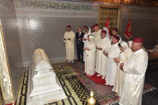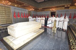 وبعد تلاوة الفاتحة ترحما على روح فقيد المغرب الكبير، سائلا المولى جلت قدرته أن يجعل جلالة المغفور لهما الملكين الراحلين الحسن الثاني ومحمد الخامس في أعلى عليين مع النبيئين والصديقين والشهداء والصالحين وحسن أولائك رفيقا، كما استحضر الوفد خلال هذه الزيارة بكل إجلال وتقدير انجازات ومسارات هذا الملك العظيم الذي رسم بصموده أسمى وأنبل صور المقاومة ضد الاستعمار من أجل استقلال الوطن ووحدته وكرامة الشعب المغربي وملهما في ذلك حركات التحرر الوطني في العالمين العربي والإسلامي وكافة الشعوب التي كانت تواقة إلى الانعتاق والحرية إلى جانب والده المنعم جلالة المغفور الملك محمد الخامس العربي والإسلامي وباقي الأقطار والشعوب التي كانت تواقة إلى الانعتاق والحرية.